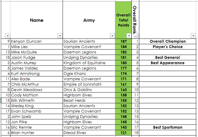 Overall Champion – Kenyon Duncan, Saurian Ancients (4-1 Record, 3 Massacres, 187 total GT Points)